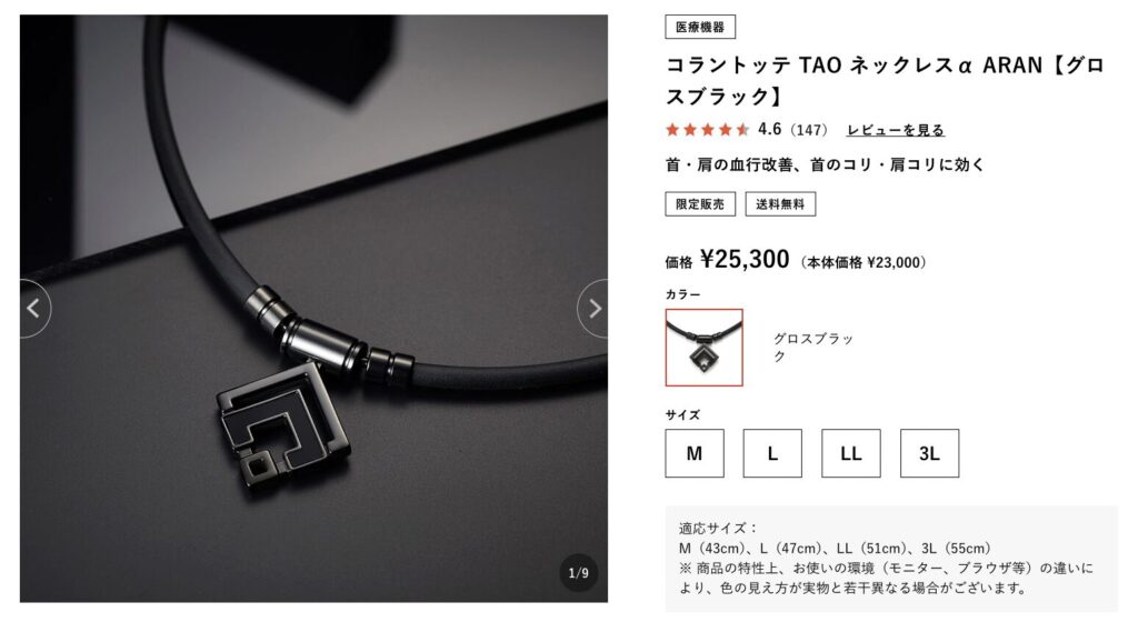例えばTAO ネックレスα ARANの場合、以下のような記載となっており、サイズはM〜3Lまでの4種類の展開です。